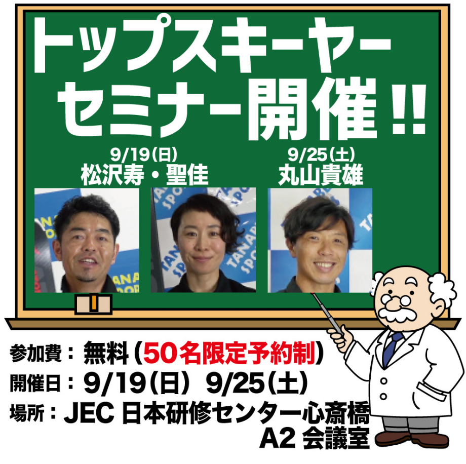 大阪・スキー専門店「タナベスポーツ」が9/19(日)、9/25(土)に「トップスキーヤーセミナー」を開催。昨年は新型コロナウィルスの影響からオンライン形式で行われたが、2年ぶりの開催となる。講師として登場するのは元ナショナルデモンストレーターの松沢寿。過去に9度の技術選チャンピオンに輝いた松沢聖佳。そして現役のナショナルデモンストレーターから丸山貴雄という豪華なラインナップ。